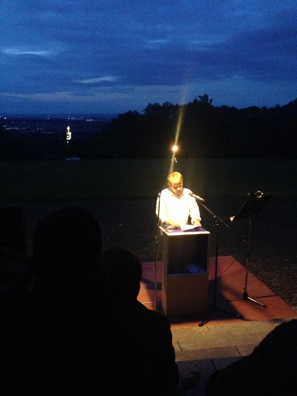 -A big one being that I read as part of Solitude Night here at the Akademie on July 5. The experience was a pretty cool one, not the least because my literature compatriots–Irish poet Annemarie Ní Churreáin and German playwright Anne Habermehl–shared their outstanding work. Also, the stage was built on the steps of die Schloss, with the reader facing the castle and the audience seated on the steps, facing the valley. I read from two pieces, some of “On the River, Down Where They Found Willy Brown” and the opening of the new novel I’ve been working on here. It was kind of nerve-wracking to present work that was written only a few weeks ago, but I feel like it went over okay. A number of people have told me they enjoyed the reading–and since they’re passing on good news, I have no reason to doubt them.